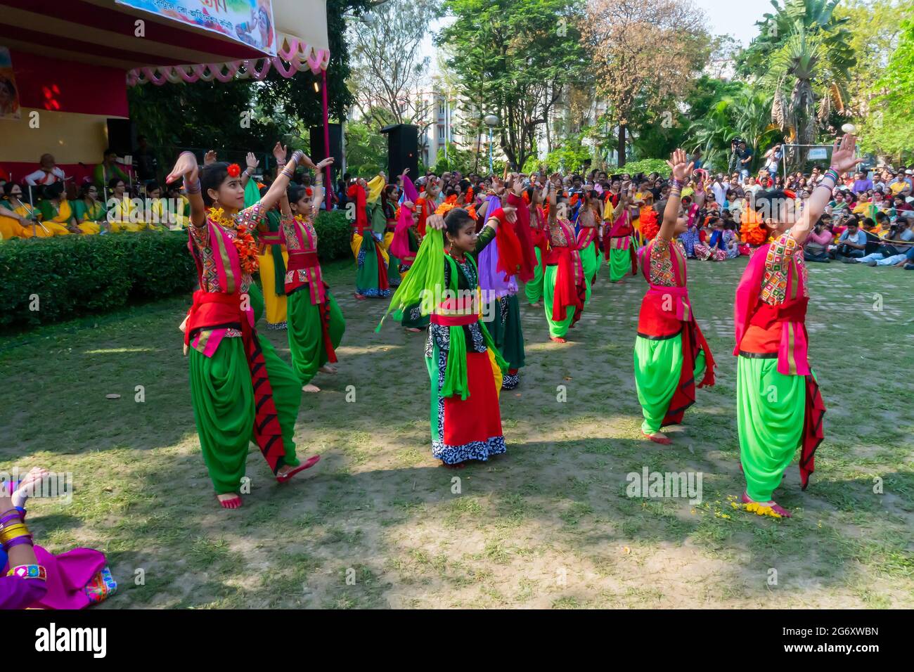 Kolkata India 21st March 2019 Girl Dancers Dressed In Sari Traditional Indian Dress With Palash Flowers Butea Monosperma Make Up Dancing At Stock Photo Alamy